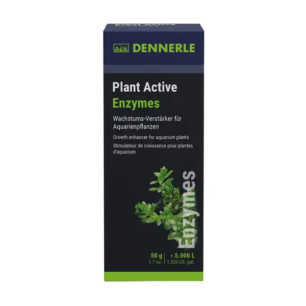 Man sollte annehmen, dass eine Pflanze maximal wächst, wenn sie ausreichende Mengen an Licht, CO2 und Nährstoffen zur Verfügung hat. Dem ist aber nicht so. Die Praxis zeigt: Es gibt noch andere Faktoren, die sich förderlich auf das Wachstum auswirken. Dennerle hat schon früh umfangreiche Untersuchungen zu diesen sekundären Wuchsfaktoren durchgeführt. Daraus ist Plant Active Enzymes entstanden. Plant Active Enzymes wirkt mehrfach. Wuchsanregende, natürliche Pflanzenenzyme stimulieren die Zellteilung. Enzyme sind Bio-Katalysatoren und für den Pflanzenstoffwechsel von zentraler Bedeutung. Sie führen z.B. Reservestoffe in lösliche Stoffe über, die der Pflanze zum Wachstum dienen. Dadurch werden die Blattneubildung und das Triebwachstum gefördert. Gerade für Aquascaper ist das Plant Active Enzymes deshalb besonders gut geeignet, vorallem nach dem Rückschnitt um den Neuaustrieb zu beschleunigen. Gleichzeitig unterstützen ausgewählte, natürliche Wirkstoffe den Bau- und Energiestoffwechsel. Sie können von der Pflanze direkt über die Blätter aufgenommen und verstoffwechselt werden. So werden die Pflanzen gekräftigt und können ihre Abwehrkräfte steigern, z.B. gegen Algenbewuchs auf den Blättern. Plant Active Enzymes wirkt außerdem positiv auf das Redox-Gleichgewicht im Aquarium. Durch Oxidation werden zahlreiche Nährstoffe oxidiert und damit für Pflanzen unwirksam gemacht (z.B. Eisen und Mangan). Durch Reduktion werden diese Nährstoffe wieder in eine für Pflanzen aufnehmbare Form überführt. Plant Active Enzymes fördert diese Reduktionsreaktionen. So werden unwirksam gewordene Pflanzennährstoffe im Aquarium remobilisiert und damit wieder pflanzenverfügbar gemacht. Das Wuchsmilieu wird optimiert. Besonders positiv: Durch die nachhaltige Förderung des Pflanzenwachstums schafft Plant Active Enzymes gleichzeitig ungünstige Wuchsverhältnisse für Algen. Vorhandene Algen werden gebremst, Neuveralgung wird deutlich reduziert.