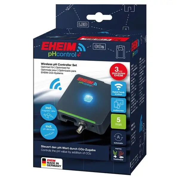 Mit dem EHEIM pHcontrol+e kannst du den pH-Wert in dinem Aquarium per Smartphone, Tablet, PC/MAC einfach überwachen und optimieren. Dies geschieht über eine WiFi-Verbindung und deinen Webbrowser. Ein pH-Sensor misst den aktuellen pH-Wert des Wassers, und der pHcontrol+e sorgt automatisch für die notwendige CO2-Zufuhr. Hierzu steuert er das zur CO2-Anlage zwischengeschaltete Magnetventil an. Dieses gibt bei Bedarf so viel CO2 zu, bis der gewünschte pH-Wert erreicht ist.