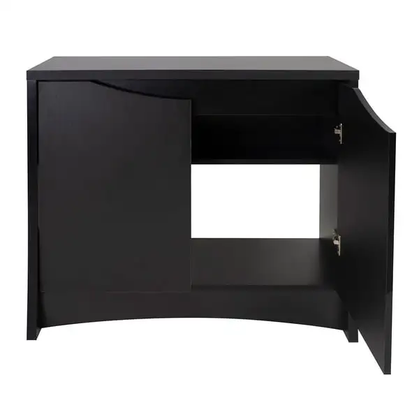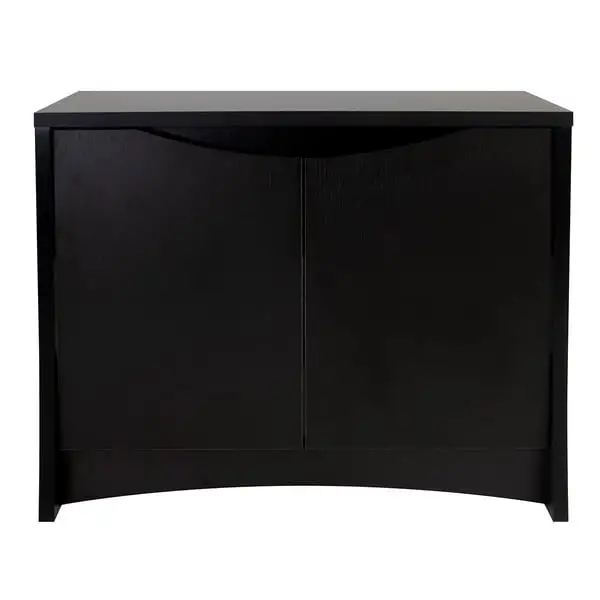 Der integrierte Regalboden bietet Aufbewahrungsraum für Futter, Reinigungsutensilien und Zubehör. Der Schrank Deluxe verfügt über Schwingtüren ohne Griffe. Die Halboffene Rückwand ermöglicht eine ordentliche Kabelanordnung.