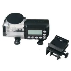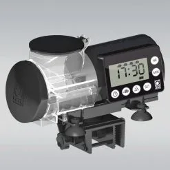 Der JBL Futterautomat für Aquarien Sonderedition schwarz/transparent & weiß/transparent lässt sich bequem programmieren. Fütterungen können dadurch bis zu 4x täglich automatisch durchgeführt werden. Aufgrund des Luftanschlusses wird zudem eine ideale Futtertrocknung gewährleistet. Geeignet ist der Automat für alle Granulate bis 3mm. Betrieben wird das Gerät durch drei 1,5 V AA Batterien, die im Lieferumfang enthalten sind. Dank des integrierten Displays kann zudem der Zustand der Batterien bequem abgelesen werden. Kompatibel ist die Fütterungsmaschine mit dem JBL GranoColor, GranoColor mini, GranoMix, GranoMix mini, Grana, GranaCichlid, GranaDiscus, NovoBits, NovoFlower mini, Gold Pearls, Gold Pearls mini, Novo Pearls und dem MariPearls. Darüber hinaus kann neben den Futterzeiten auch die Futtermenge manuell eingestellt werden. Befestigt wird das Gerät mittels einem Sauger oder Halteklammern. Das Volumen der Automatenkammer beträgt 125ml und lässt sich durch das direkte Aufschrauben einer Futterdose auf insgesamt 375ml erweitern.
