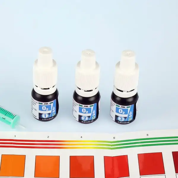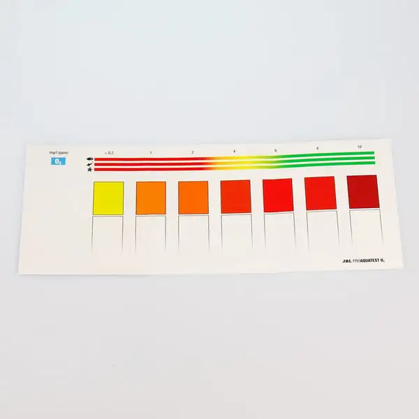 Schnelltest zur Bestimmung des Sauerstoffgehalts in Süß-/Meerwasser-Aquarien & Teichen. Zur Bestimmung des aktuellen Sauerstoffgehaltes und daraus folgernd, ob Maßnahmen zur Erhöhung des Sauerstoffgehaltes getroffen werden sollten. Schnelltest zur Belüftungskontrolle: Glasküvette mit Probewasser füllen, Reagenzien zugeben, Wert der Probe auf Farbkarte ablesen. Anwendung: Bei Neueinrichtung: 1 mal wöchentlich oder bei Anzeichen von Sauerstoffmangel. Klare, deutliche Farbanzeige gelb nach weinrot. Auf der JBL Homepage in der Themenwelt Aquarium oder Teich finden Sie ausführliche Informationen zu Wasseranalysen und Problemlösungen. Lieferumfang: 1 Schnelltest. Inhalt für ca. 40 Messungen. Inkl. 3 Reagenzien, Spritze, Glasküvette mit Schraubverschluss und Farbkarte. Nachfüll-Reagens separat erhältlich.