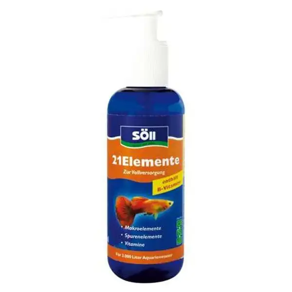 Dosierung: Geben Sie alle 7 Tage 7,5 ml (3 Hübe) Söll 21Elemente pro 100 Liter in das Aquarienwasser. Vor Gebrauch schütteln.